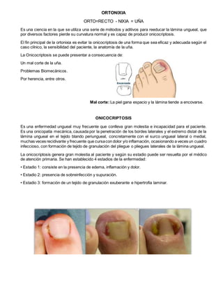 Este documento describe varios métodos y materiales utilizados en ortonixia para corregir y proteger las uñas. La ortonixia es una ciencia que reeduca las uñas cuando pierden su curvatura normal mediante técnicas como clips, brackets, botones y férulas para evitar la onicocriptosis. Los materiales incluyen fibras, alambre, acrílico y otros aditivos que ejercen tracción en la uña para corregir su curvatura.