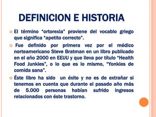 Este documento describe la ortorexia, un trastorno alimentario definido por una obsesión por comer alimentos considerados saludables. Las personas con ortorexia pasan más de 3 horas al día pensando en su dieta y se preocupan más por la calidad de los alimentos que por el placer de comer. A medida que aumenta su pseudocalidad alimentaria, disminuye su calidad de vida. El tratamiento requiere un enfoque multidisciplinario que incluye terapia psicológica y nutricional para lograr una dieta más equilibrada