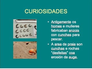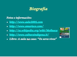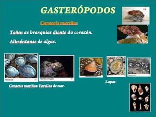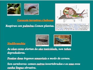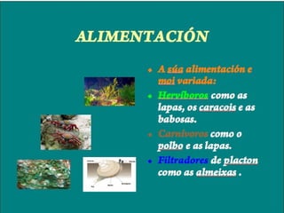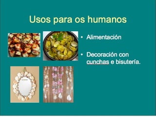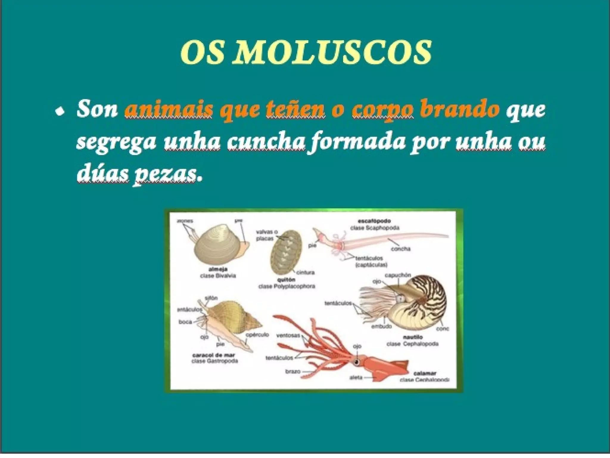 Presentación dos moluscos en galego para nenos e nenas de educación primaria. Definición, tipos, alimentación, respiración, usos humanos e curiosidades.