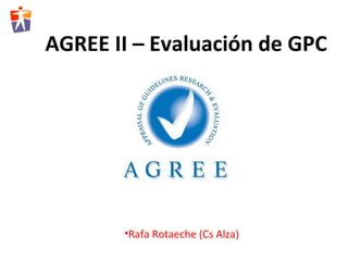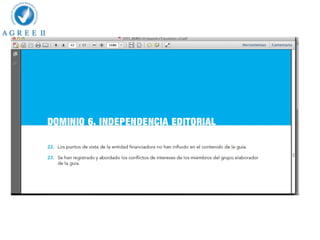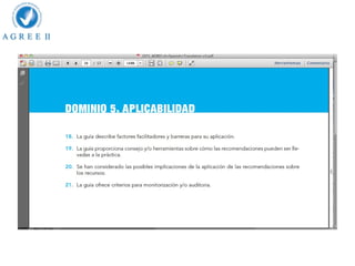 El documento proporciona una introducción al Instrumento AGREE II, el cual evalúa la calidad y rigurosidad metodológica de las guías de práctica clínica. El instrumento contiene 23 ítems agrupados en 6 dominios: alcance y objetivo, participación de los implicados, rigor de elaboración, claridad de presentación, aplicabilidad e independencia editorial. El documento explica cómo utilizar el instrumento para evaluar cada uno de los dominios de una guía clínica.