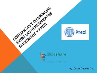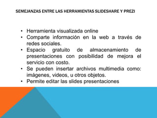 SlidesShare y Prezi son herramientas para crear y compartir presentaciones en línea de manera gratuita. Ambas permiten insertar archivos multimedia, editar diapositivas, y almacenar presentaciones en la nube para acceso desde cualquier lugar. Mientras que SlidesShare utiliza un formato tradicional de diapositivas, Prezi utiliza un solo lienzo interactivo y dinámico donde se puede zoom y desplazarse.