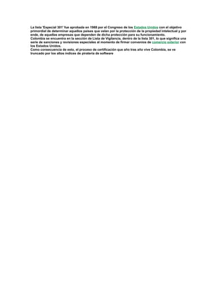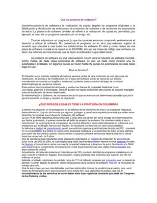 El documento trata sobre la piratería de software. Define la piratería de software como la realización de copias ilegales de programas originales o la falsificación y distribución de versiones no autorizadas. Explica que cuando se compra software se adquiere solo el derecho a utilizarlo, no la propiedad del programa. Además, señala que la piratería de software es una preocupación para la industria mundial y que en algunos países se hacen hasta 99 copias no autorizadas por cada copia legal.