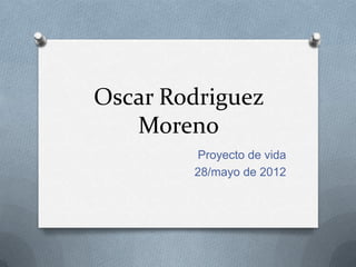 Este documento presenta el proyecto de vida de Oscar Rodriguez Moreno. Su misión en la vida personal es terminar sus estudios y estudiar publicidad. Profesionalmente, quiere conseguir un trabajo estable en publicidad y especializarse en diseño gráfico. A largo plazo, desea ser un buen hijo, hermano y padre, tener su propia casa, y viajar por el mundo. Su objetivo es terminar sus estudios y convertirse en un profesional de publicidad en 10 años. Creció en una familia humilde pero cariñosa en Bogotá.