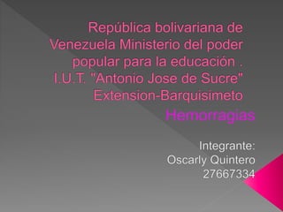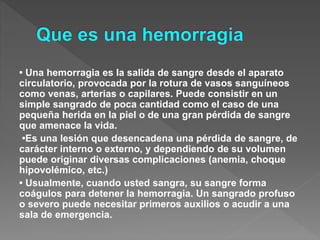 Una hemorragia es la salida de sangre del cuerpo a través de vasos sanguíneos rotos, lo que puede causar desde un sangrado leve hasta una pérdida masiva de sangre que amenace la vida. Las hemorragias se clasifican según su origen (interno o externo), el tipo de vaso afectado (capilar, venoso o arterial) y su causa. El tratamiento depende de la gravedad de la hemorragia, desde aplicar presión directa para detener un sangrado externo hasta transfusiones de sangre para reemplazar