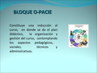 El documento describe las secciones del Bloque O-PACIE de un curso en línea. El Bloque O-PACIE constituye una introducción al curso y contempla aspectos pedagógicos, sociales, técnicos y administrativos. Sus secciones principales son Información, Comunicación e Interacción, las cuales proveen orientación para los estudiantes, lineamientos del curso y apoyo grupal respectivamente.