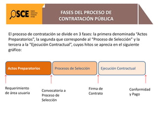 El documento resume las tres fases del proceso de contratación pública: los actos preparatorios, el proceso de selección y la ejecución contractual. Luego detalla los requisitos para suscribir un contrato, incluyendo constancias, garantías y documentos requeridos. Finalmente, explica los plazos y procedimientos para suscribir el contrato de manera oportuna.