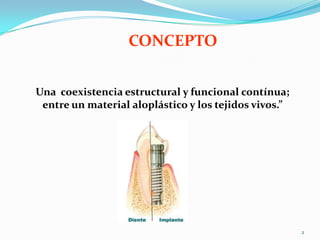 El documento habla sobre los conceptos de fibrorintegración y osteointegración de implantes dentales. Explica que la osteointegración, que es la unión estructural y funcional continua entre el hueso y el implante, reemplazó al concepto anterior de fibrorintegración, que era la encapsulación del implante con tejido conectivo. También menciona factores que afectan la osteointegración como el diseño del implante y la técnica quirúrgica.
