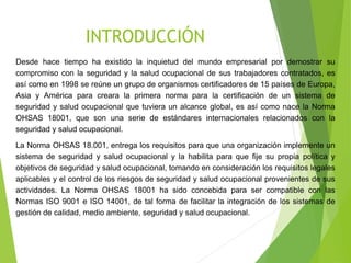 El documento presenta una introducción a la Norma OHSAS 18001, que establece los requisitos para que una organización implemente un sistema de gestión de seguridad y salud ocupacional. Explica que la norma proporciona un marco para que las organizaciones identifiquen, evalúen y controlen los riesgos y mejoren su desempeño en este ámbito. Además, resume los elementos clave de un sistema de gestión de seguridad y salud ocupacional según la norma OHSAS 18001.