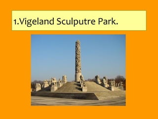 El documento lista 10 lugares para visitar en Oslo, Noruega, incluyendo el Parque Escultórico Vigeland, la Ópera, la Fortaleza Akershus, la Galería Nacional, Holmenkollen, el Museo Munch, Karl Johans gate, el Museo de Barcos Vikingos, el Palacio Real y el Museo de Folclore Noruego. El autor menciona que sus lugares favoritos fueron la Ópera, Holmenkollen, el Palacio Real y el Museo de Folclore Noruego.