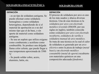 Este documento compara dos técnicas de soldadura: la soldadura oxiacetilénica y la soldadura por arco con electrodo metálico revestido (SMAW). La soldadura oxiacetilénica utiliza una llama producida por la combustión de acetileno y oxígeno para fundir el metal, mientras que la SMAW genera un arco eléctrico entre un electrodo recubierto y la pieza de trabajo. Ambos procesos se usan comúnmente para soldar acero u otros metales, pero la SMAW requiere