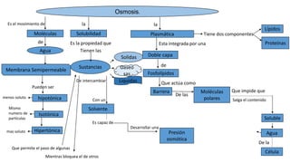 La osmosis es el movimiento de moléculas de agua a través de una membrana semipermeable. Una membrana semipermeable permite el paso de agua pero bloquea el paso de otras sustancias como iones y moléculas grandes. La osmosis ocurre cuando dos soluciones de diferente concentración están separadas por una membrana semipermeable, moviéndose el agua de la solución más diluida a la más concentrada hasta que se iguala la presión osmótica de ambos lados.