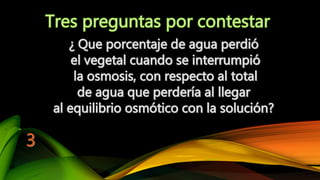 Este documento presenta cálculos para determinar los coeficientes de difusión de la papa y la jícama en soluciones de diferentes grados Brix. Se calculan los equilibrios osmóticos, la humedad perdida por hora, y las pendientes de las rectas de Ln(humedad) contra el tiempo para obtener los coeficientes de difusión en m2/s. Los resultados muestran que la papa y la jícama tienen mayores coeficientes de difusión en soluciones más concentradas.