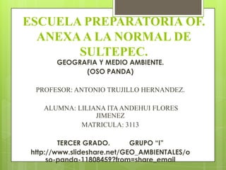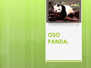 Este documento proporciona información sobre la taxonomía, anatomía, fisiología, hábitat, dieta y amenazas del oso panda gigante. Explica que el panda pertenece al orden de los carnívoros y familia de los osos, y que a pesar de su apariencia herbívora se alimenta de bambú y otras plantas así como pequeños animales. Describe su hábitat en los bosques de bambú del centro de China y los desafíos que enfrenta debido a la pérdida de hábitat.