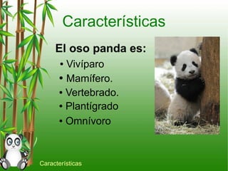 El oso panda gigante es un mamífero vertebrado plantígrado y omnívoro que vive en bosques de bambú en seis regiones montañosas de China. Está en peligro de extinción, con solo 1,000 osos restantes en libertad en China y unos 100 en zoos de otras partes del mundo, por lo que se necesitan esfuerzos de protección.