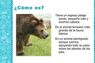 El oso pardo es el animal terrestre más grande de la fauna ibérica, con pelaje pardo y patas plantígradas. Actualmente vive en bosques caducifolios de la Cordillera Cantábrica y los Pirineos, donde se alimenta principalmente de vegetación aunque también de insectos, peces y otros animales. Son difíciles de ver y suelen hibernar en invierno en cuevas o árboles, donde las hembras dan a luz crías cada 2-3 años. Su conservación requiere vigilancia contra la caza furtiva y