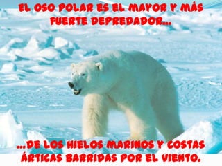 El oso polar es el mayor depredador de las regiones árticas de Rusia, Noruega, Groenlandia, Canadá y Alaska. Son carnívoros que se alimentan principalmente de focas, aunque también comen huevos, algas, desperdicios y en ocasiones otros osos polares. Pesan entre 400 y 730 kg y viven en promedio 25-30 años. Su pelaje blanco les sirve de camuflaje y su piel negra absorbe la luz solar. Son excelentes nadadores y no tienen depredadores naturales, aunque los machos a veces