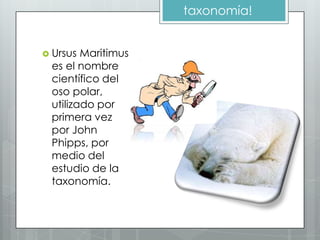 El documento proporciona información sobre el oso polar desde diferentes perspectivas como su taxonomía, etimología, antropología, histología, embriología, glaciología, climatología, geografía, nutrición animal, anatomía animal, etología y zoología. El oso polar (Ursus maritimus) es un depredador carnívoro adaptado a vivir en el Ártico que se ha divergido genéticamente del oso pardo hace 150,000 años y cuyo linaje evolutivo se remonta a los mi