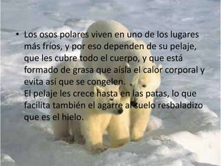 Los osos polares vagan por el hielo ártico, nadan hacia las zonas costeras y se alimentan de animales marinos. Son expertos nadadores que dependen de su grueso pelaje blanco para sobrevivir en el frío extremo. Las hembras dan a luz cachorros en invierno dentro de una cueva en la nieve y los crían durante casi 30 meses antes de que aprendan a sobrevivir por sí mismos. El oso polar es el mayor depredador terrestre del Ártico aunque su población está disminuyendo debido