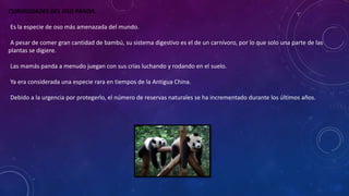 Los osos panda pasan la mitad del día comiendo 12,5 kilos de bambú y hacen sus necesidades docenas de veces, son animales solitarios que viven en remotas montañas de China donde encuentran bambú húmedo y fresco, y solo quedan alrededor de 1000 osos panda en libertad.
