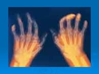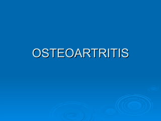 La osteoartritis es el trastorno articular más común que causa desgaste del cartílago entre los huesos, llevando a dolor y rigidez. Puede ser primaria u ocasionada por trauma, y afecta comúnmente rodillas, manos, caderas y espina dorsal. Los síntomas incluyen dolor que empeora con ejercicio y mejora con descanso, rigidez matutina y limitación de movimiento. El tratamiento se enfoca en aliviar el dolor, mantener la movilidad y minimizar la discapacidad mediante