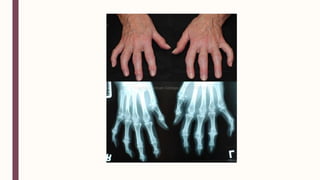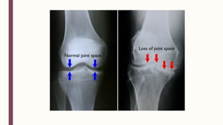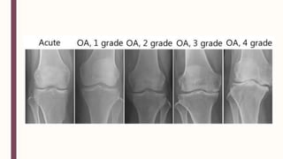 El documento resume las causas, síntomas, diagnóstico y tratamientos de la osteoartritis, incluyendo factores de riesgo como la edad, genética, obesidad y actividades repetitivas. Describe los cambios patológicos en el cartílago y hueso subyacente, y los enfoques de tratamiento no farmacológicos, farmacológicos y quirúrgicos.