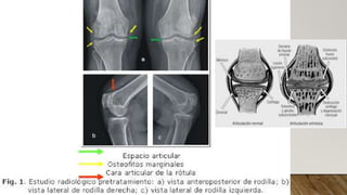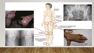 La artrosis es la forma más frecuente de enfermedad articular degenerativa. Se caracteriza por un proceso degenerativo doloroso con deterioro progresivo de las estructuras articulares sin inflamación primaria. Los factores de riesgo incluyen la edad, sexo femenino, obesidad, trauma y genética. El tratamiento se enfoca en controlar los síntomas con ejercicio, peso corporal, fármacos como paracetamol y AINEs, e intervenciones quirúrgicas como prótesis en etapas avanzadas.