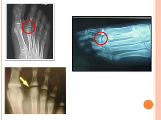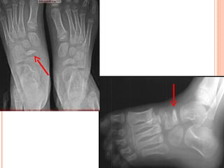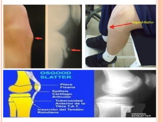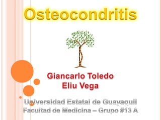 El documento resume las características y tipos principales de osteocondritis. Define la osteocondritis como enfermedades óseas que afectan a jóvenes en periodo de crecimiento rápido y de mayor actividad física, causando dolor y posibles secuelas deformantes. Describe varios tipos específicos como la enfermedad de Freiberg, Kohler, Panner y Sever, detallando sus mecanismos, síntomas y tratamientos.