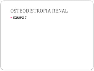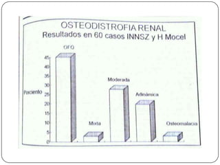 Este documento describe las diferentes formas de osteodistrofia renal que pueden ocurrir como complicación de la insuficiencia renal terminal. Incluye lesiones de alto remodelamiento como la osteítis fibrosa quística y la enfermedad mixta, causadas por niveles elevados de hormona paratiroidea. También describe lesiones de bajo remodelamiento como la osteomalacia y la enfermedad adinámica del hueso, asociadas con niveles bajos de PTH. Explica los mecanismos fisiopatológicos,