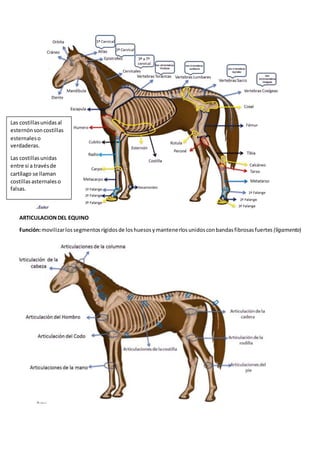 El documento describe la osteología equina, dividiendo el esqueleto en axial y apendicular. Explica que el esqueleto soporta y protege las partes blandas del cuerpo a través de huesos y cartílagos, y que las articulaciones movilizan los segmentos rígidos de los huesos manteniéndolos unidos mediante ligamentos.