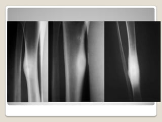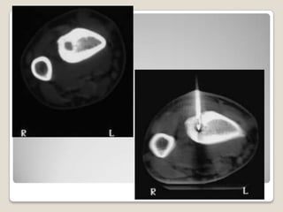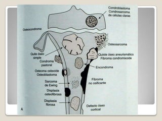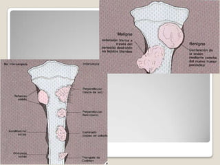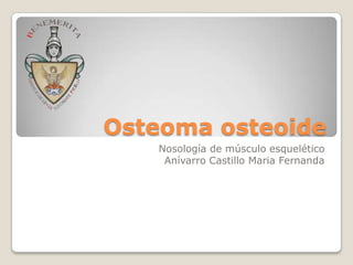 El documento describe el osteoma osteoide, un tumor óseo benigno que se caracteriza por ser de pequeño tamaño, tener crecimiento lento y no metastatizar. Se localiza principalmente en los huesos largos como el fémur y la tibia. El diagnóstico se realiza mediante radiografías, tomografía computarizada y confirmación histológica. El tratamiento incluye la resección quirúrgica o ablación por radiofrecuencia para aliviar el dolor agudo que causa.