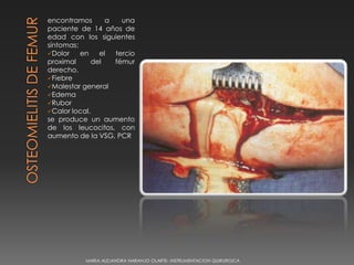Una paciente de 14 años presentó dolor en el tercio proximal del fémur derecho, fiebre, malestar general, edema, rubor y calor local. Las pruebas de diagnóstico como radiografía, biopsia de hueso y hemocultivo revelaron que padecía osteomielitis de fémur, una infección ósea. Su tratamiento consistió en analgésicos para el dolor, antibióticos para detener la infección y terapia para recuperar la movilidad del miembro inferior.