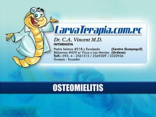 Este documento presenta 5 casos de pacientes con osteomielitis y gangrena que fueron tratados exitosamente con larvas medicinales sin necesidad de amputaciones. Los pacientes tenían condiciones como diabetes, infecciones resistentes a antibióticos y necrosis ósea extensa. Tras el tratamiento con larvas durante varias semanas, los huesos y tejidos afectados sanaron completamente sin complicaciones.
