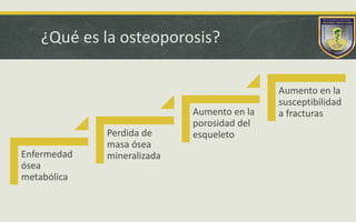La osteoporosis es una enfermedad ósea metabólica caracterizada por la pérdida de masa ósea y un aumento en la porosidad del esqueleto, lo que incrementa el riesgo de fracturas, especialmente en mujeres mayores de 50 años. La patogénesis de la enfermedad puede estar influenciada por factores genéticos, hormonales, nutricionales y de estilo de vida, aunque la enfermedad inicialmente puede no presentar síntomas. El tratamiento incluye ejercicio, ingesta de calcio y vitamina D, así como medicamentos específicos.