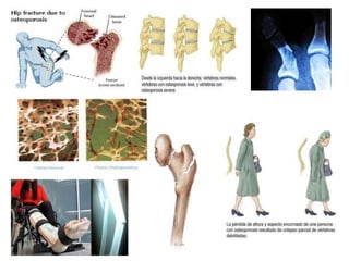 La osteoporosis es la reducción de la masa ósea que hace que los huesos se vuelvan frágiles y susceptibles a fracturas. Se produce principalmente por deficiencia de calcio o por disminución de estrógenos durante la menopausia. Sus síntomas incluyen dolor óseo y pérdida de estatura. Se diagnostica mediante una prueba de densitometría ósea y su tratamiento implica suplementos de calcio y vitamina D, así como medicamentos como bifosfonatos para prevenir la pérdida ósea.