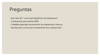 El documento proporciona información sobre el diagnóstico, seguimiento y tratamiento de la osteoporosis. Un T-score menor a -2.5 hace diagnóstico de osteoporosis. Las indicaciones para una densitometría ósea incluyen mujeres mayores de 65 años y aquellas con factores de riesgo. Las medidas generales de prevención son una dieta saludable, ejercicio, exposición al sol y evitar caídas. Los fármacos para el tratamiento de la osteoporosis incluyen bifosfonatos, teriparatida, ter