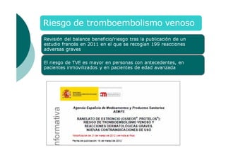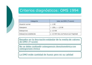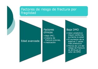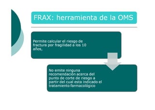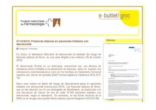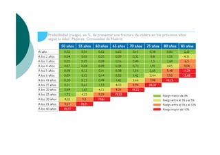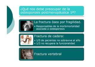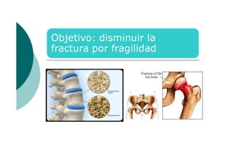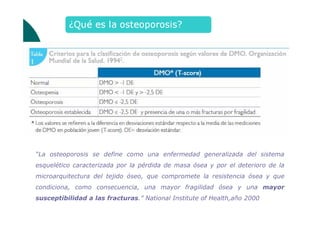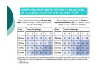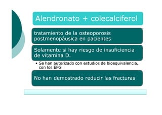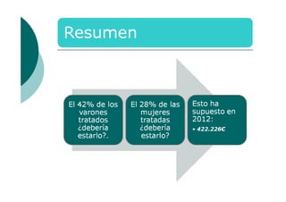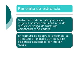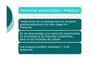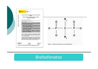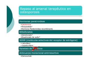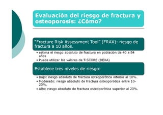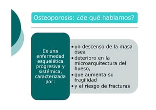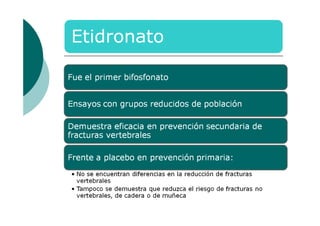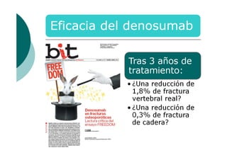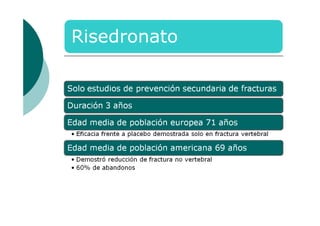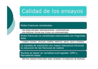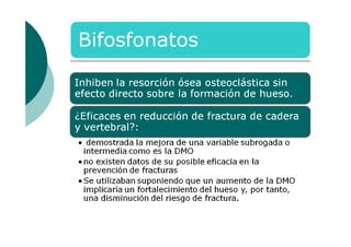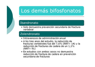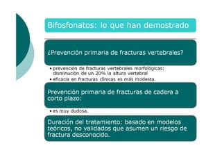 Este documento presenta información sobre el tratamiento de la osteoporosis, incluyendo recomendaciones, estudios de fármacos, riesgos y beneficios. Contiene gráficos sobre el número de pacientes tratados y gastos en 2012 según edad y sexo. También discute la eficacia de varios fármacos para prevenir fracturas y sus posibles efectos secundarios.