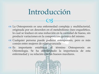 I. La osteoporosis es una enfermedad que causa una reducción en la cantidad de hueso sin afectar su composición química, lo que aumenta la fragilidad ósea y el riesgo de fracturas. II. Los principales factores de riesgo son ser mujer y la edad avanzada, y se relaciona con la disminución de estrógenos y testosterona. III. El tratamiento incluye medicamentos, calcio, vitamina D, ejercicio y prevención de caídas para evitar fracturas futuras.