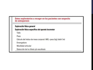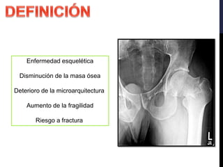 Este documento trata sobre la osteoporosis. La osteoporosis es una enfermedad esquelética caracterizada por la disminución de la masa ósea y el deterioro de la microarquitectura ósea, lo que aumenta el riesgo de fracturas. La osteoporosis es más común en mujeres posmenopáusicas entre las edades de 50 y 80 años. Algunos factores de riesgo no modificables incluyen la edad, el sexo y la genética, mientras que factores modificables incluyen el sedentarismo, la dieta b