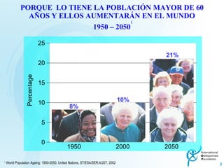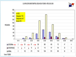 Este documento trata sobre la osteoporosis y por qué es importante conocer sobre esta enfermedad. Explica que la osteoporosis afecta la masa ósea y debilita los huesos, lo que aumenta el riesgo de fracturas. También destaca que la población de adultos mayores está creciendo a nivel mundial, por lo que la osteoporosis se convertirá en un problema de salud más grande. Finalmente, resalta la importancia de prevenir la osteoporosis desde la infancia a través de una dieta balanceada y actividad fís