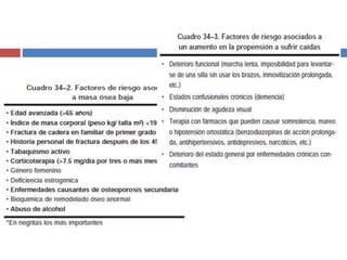 Este documento define la osteoporosis como una enfermedad esquelética caracterizada por un deterioro en la resistencia del hueso que predispone a fracturas. Explica la fisiología, epidemiología, etiología, factores de riesgo y tratamiento de la osteoporosis. Algunos de los puntos principales son que afecta principalmente a mujeres posmenopáusicas y ancianos, se debe a un desequilibrio entre la formación y resorción ósea, y los factores de riesgo incluyen la edad, sexo femenino,