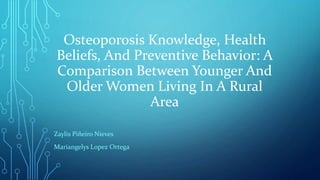 Este estudio comparó el conocimiento, creencias sobre la salud y comportamientos preventivos relacionados con la osteoporosis entre 104 mujeres jóvenes de 20-35 años y 83 mujeres mayores de 60 años que viven en una zona rural de Tailandia. Los resultados mostraron que las mujeres jóvenes tenían un mayor nivel educativo pero menos conocimiento sobre la osteoporosis y sus factores de riesgo en comparación con las mujeres mayores. Además, las mujeres jóvenes reportaron una ingesta menor de calcio, lo que las hace más propensas a desarrollar