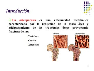 La osteoporosis es una enfermedad caracterizada por la reducción de la masa ósea y el adelgazamiento de las trabéculas óseas, lo que provoca fracturas frecuentes en las vértebras, cadera y antebrazo. La osteoporosis significa literalmente "hueso poroso" y se produce por una disminución progresiva de la masa ósea, haciendo que los huesos se vuelvan más frágiles. El calcio, el fósforo y hormonas como la paratiroidea, el crecimiento, la