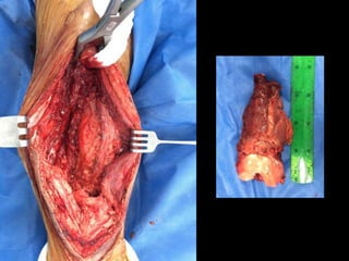 Este documento proporciona información general sobre el osteosarcoma, incluyendo su incidencia, factores de riesgo genéticos, manifestaciones clínicas, pruebas de diagnóstico, clasificación, tratamiento y pronóstico. El osteosarcoma es el sarcoma óseo primario más común que afecta principalmente a adolescentes y adultos jóvenes. Su tratamiento implica quimioterapia neoadyuvante y resección quirúrgica amplia, con buenos resultados si se logra una necrosis tumoral superior al 90%.