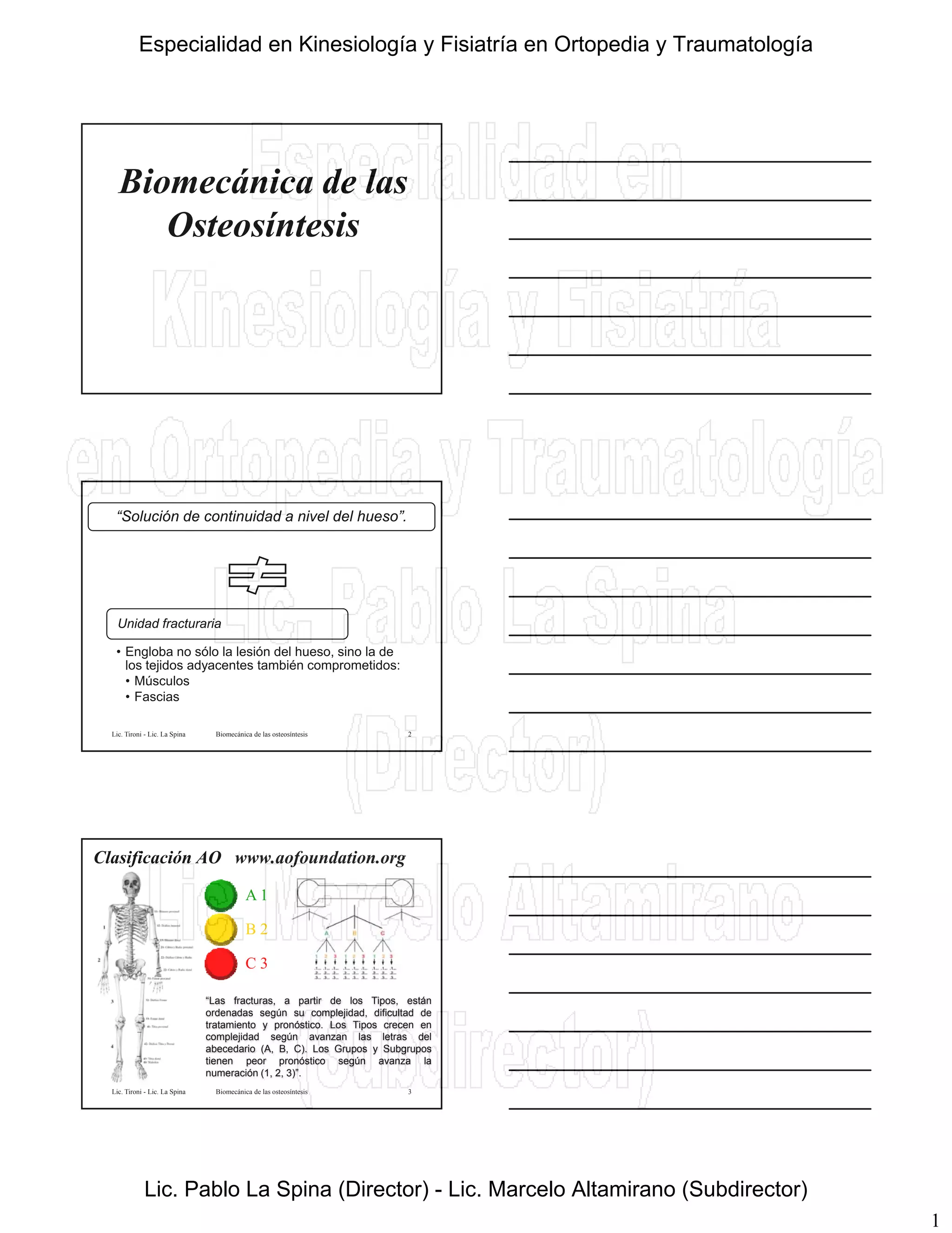 El documento describe los conceptos fundamentales de la biomecánica de las osteosíntesis. Explica la clasificación de las fracturas según la AO, las fases de la consolidación ósea, los tipos de lesiones asociadas y los implantes utilizados en la osteosíntesis como tornillos, placas y clavos. Además, distingue entre osteosíntesis rígidas que requieren osificación primaria antes de cargar y osteosíntesis dinámicas que permiten el movimiento temprano.