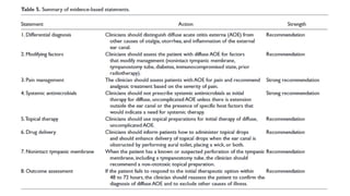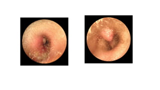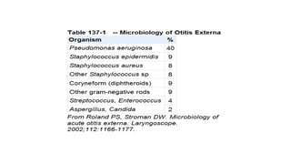 Este documento describe la anatomía del oído externo y las infecciones del oído externo como la otitis externa. Explica que la otitis externa puede ser difusa o circunscrita y puede ser causada por bacterias o hongos. El tratamiento incluye debridamiento, acidificación del conducto auditivo externo con vinagre u otros productos, y gotas tópicas de antibióticos con o sin esteroides. También se mencionan complicaciones como la celulitis y la otomicosis, así como la otitis externa