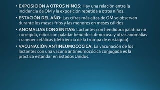 La trompa de Eustaquio protege el oído medio y mantiene la presión equilibrada. La otitis media aguda causa fiebre, irritabilidad y dolor de oído, con derrame y enrojecimiento del tímpano. A menudo se resuelve espontáneamente pero a veces requiere antibióticos. La otitis media recurrente se define por 3 o más episodios en 6 meses y puede tratarse con antibióticos profilácticos o cirugía. La otitis media con derrame implica líquido detrás de un t