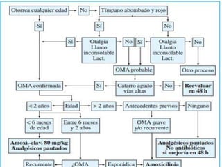 La otitis media aguda es una infección bacteriana o viral en la cavidad media del oído que causa la presencia de exudado. Los síntomas incluyen dolor de oído, fiebre y llanto. Es más común en niños pequeños y lactantes. Se diagnostica mediante examen del tímpano y los síntomas. El tratamiento consiste en antibióticos y analgésicos. Puede complicarse con mastoiditis, parálisis facial u otras infecciones graves.