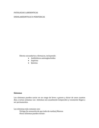 Este documento describe varias patologías del laberinto, incluyendo la laberintitis (una inflamación del laberinto que puede causar vértigo, mareos y pérdida auditiva), el síndrome de Meniere (caracterizado por vértigo, acúfenos, hipoacusia y sensación de oído tapado), la parálisis vestibular súbita (causa intensos vértigos y signos neurovegetativos asociados con invalidez transitoria), y el trauma acústico (alteración progresiva e irreversible del