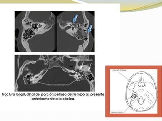 Este documento describe las fracturas del hueso temporal, incluyendo su clasificación en fracturas transversales y longitudinales. Explica los síntomas como hipoacusia, vértigo y parálisis facial. También cubre las complicaciones como fuga de líquido cefalorraquídeo y fístulas perilinfáticas, así como el tratamiento para estas fracturas.
