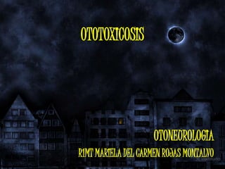 Este documento describe la ototoxicidad, que son las causas exógenas e endógenas de hipoacusia neurosensorial, incluyendo medicamentos como aminoglucósidos y diuréticos, así como tóxicos como tabaco, alcohol e inhalantes. Explica los efectos histopatológicos y los síntomas como vértigo y hipoacusia. Identifica factores como la dosis, vía de administración y predisposición individual que afectan la toxicidad.